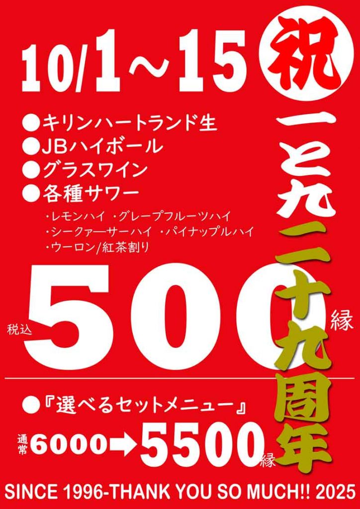 10/1㊌から15㊌まで生ビール、グラスワイン、JBハイボール、各種サワーが